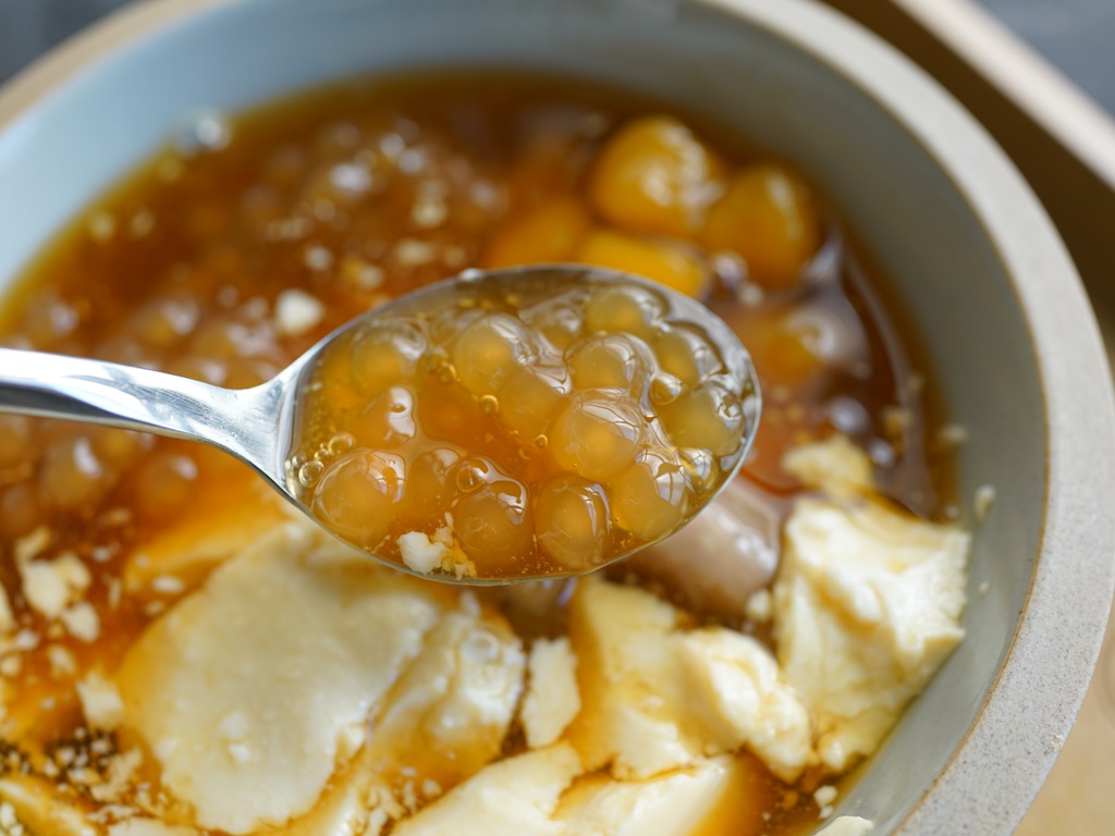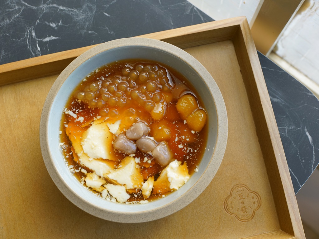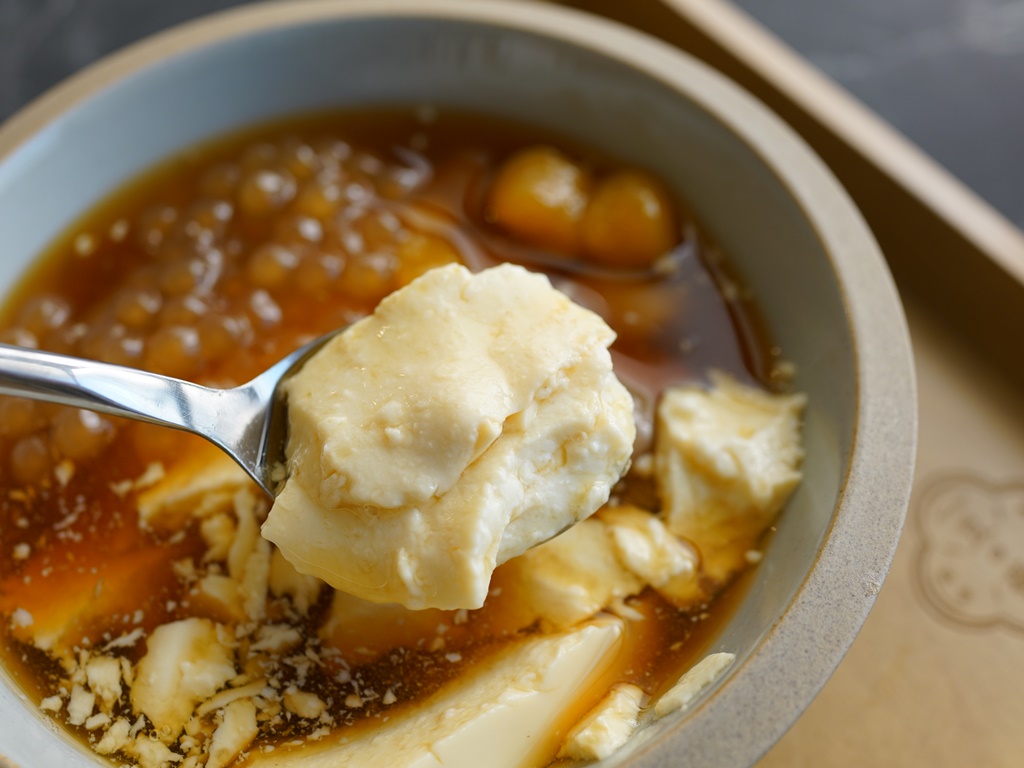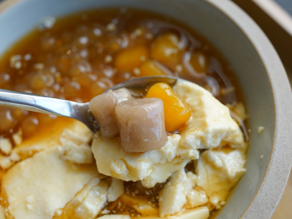 純手工製作的鹽滷豆花,口感綿密細緻,豆香味十足,配料芋圓跟粉圓也都表現不錯,可惜對我來說糖水稍微偏甜,吃幾口就很膩,如果不喜歡吃太甜可以換薑汁或+5元加無糖豆漿,不過據好友小葉的心得,鹽滷豆花加無糖豆漿好像沒有很搭,看來店家在豆花糖水的部分還需要再琢磨,期待未來會更好囉~