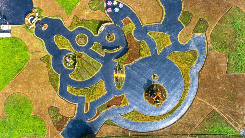 • 景觀撒播區:大片鮮艷亮麗金黃色的太陽麻花田,再利用多種顏色波斯菊和百日草在大地上撒播出幾何玫瑰、撲克牌等繽紛色彩的花海地景。