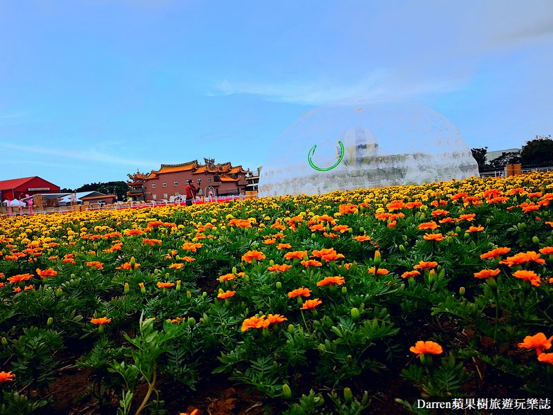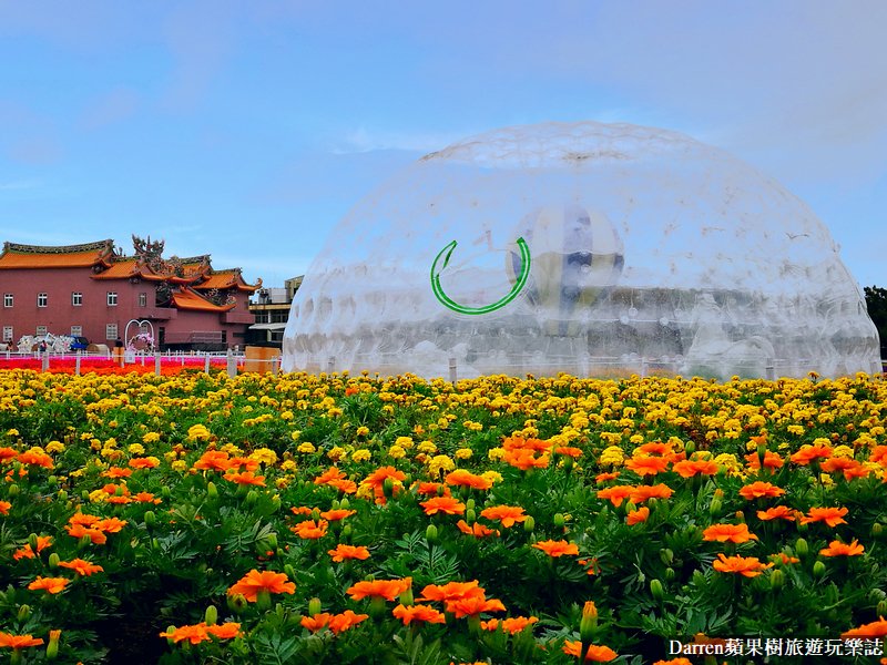拍爽拍到甘願的落羽松之後,走回花海又發現到有泡泡氣球屋藝術裝置,搭配花海景色就好像是美到破錶的大泡泡在五顏六色花海中出現