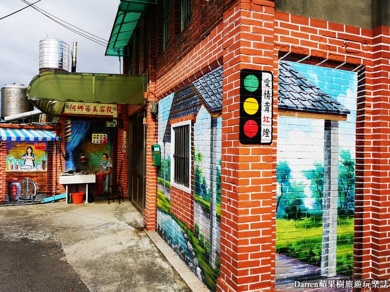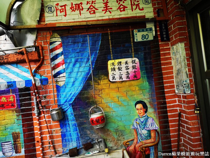60年代美容院令人懷念,以前去剪頭髮的地方,在店外面都會有那個彩色霓虹燈在那邊轉吧轉吧,坑口彩繪村的彩繪裡頭,樹小編覺得最有特色的就是這裡,彩繪整個融入到紅磚屋裡頭,能感受到更多古早味