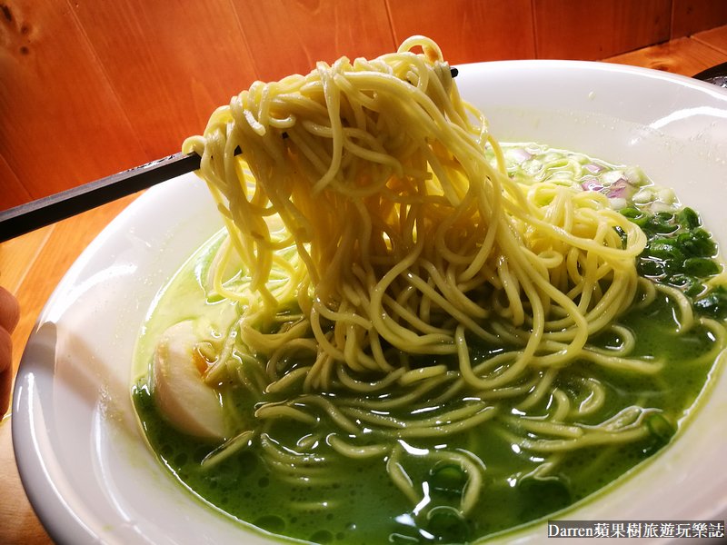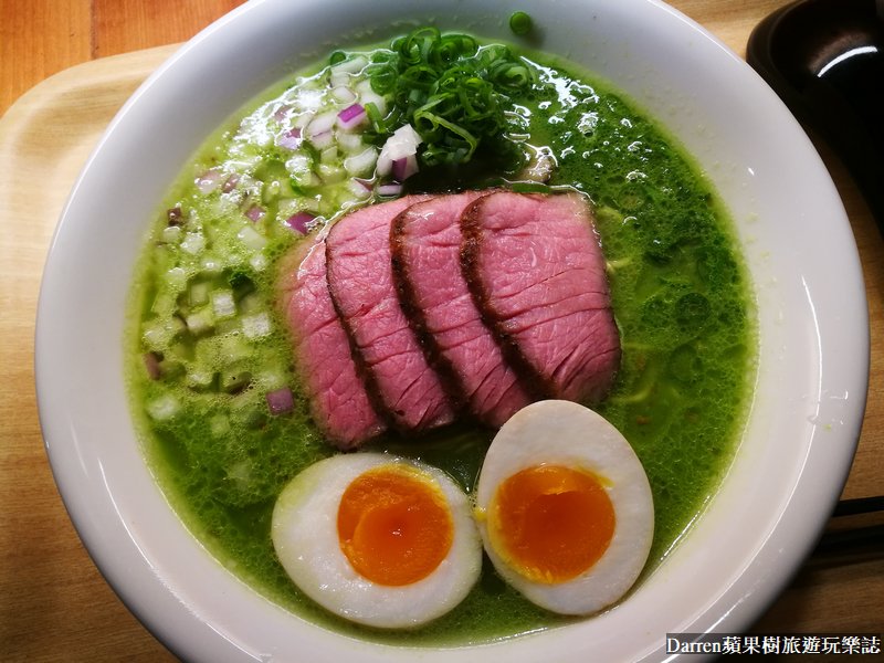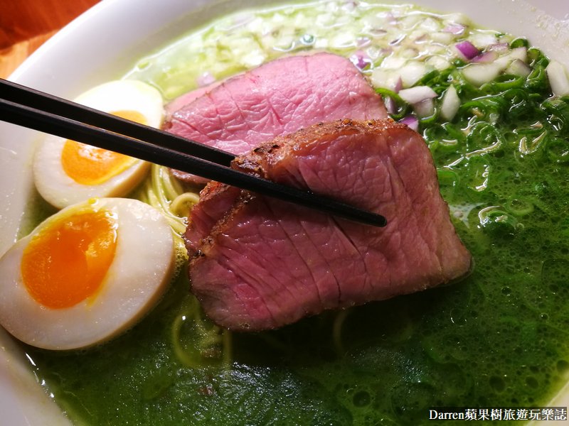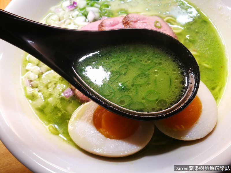 翡翠叉燒拉麵,綠色湯頭有滿滿蔥花和洋蔥,蔥香四溢帶點微辛辣刺激感,湯頭怎麼舀會都有蔥花,還有粉嫩叉燒肉,紅配綠的配色,在視覺上非常誘人!!喜歡吃蔥花的朋友,應該會喜歡蔥花所帶來的味覺衝擊