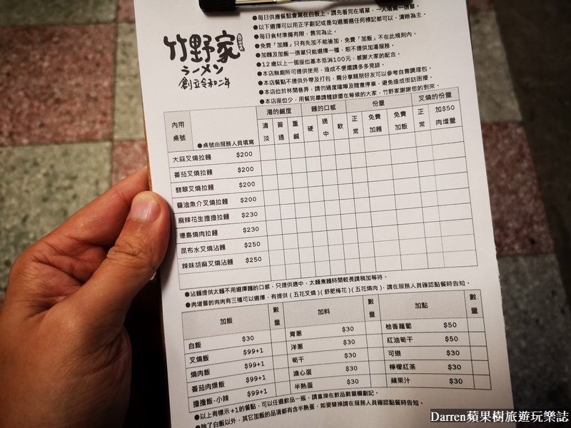 竹野家拉麵菜單MENU,菜單是參考用看一下他們的品項有哪些,重點是每日供應餐點會寫在白板上,請先看完白板在填單,一個人就填寫一張依此類推
