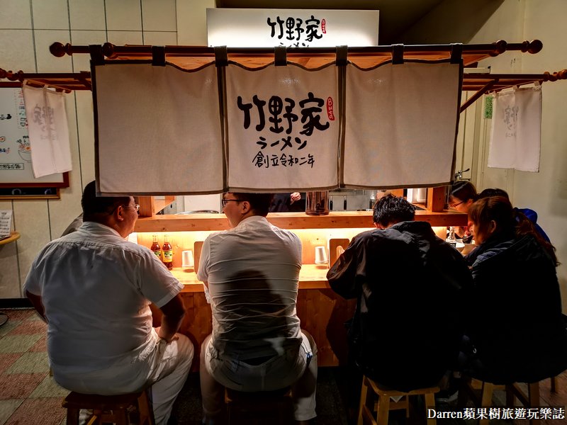 竹野家拉麵店外觀就像在日本九州吃屋台拉麵的氛圍,每次來不論是用餐區或候位區都有滿滿的人潮,一次只能接待8個客人,我每次來吃拉麵都算很早就來報到,然後沒有多久就連候位區都客滿了,拉麵攤位上通常都有兩個人,一個人負責料理,另一個人登記候位帶位和上菜
