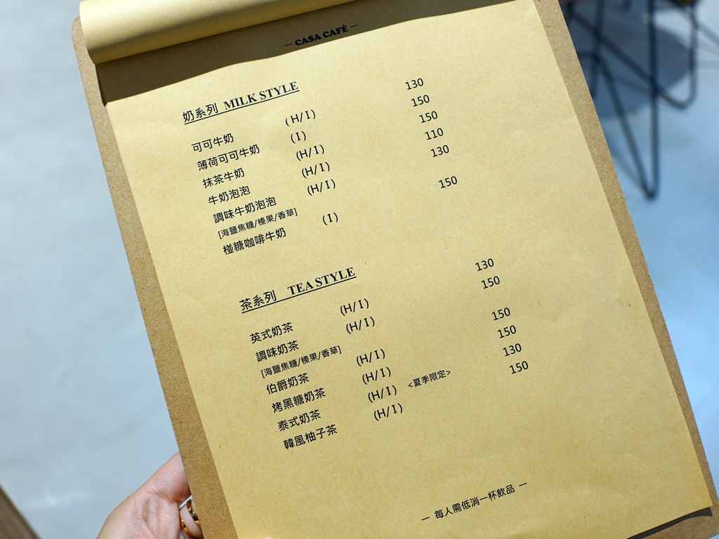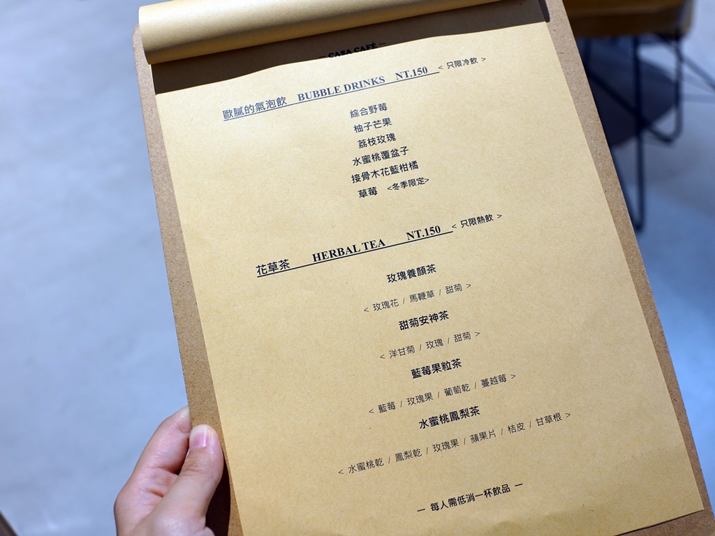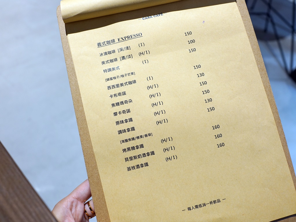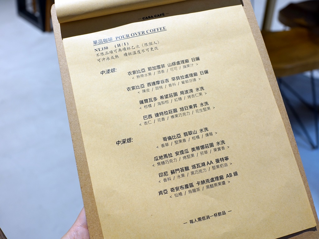 提供單品咖啡、義式咖啡、奶系列、茶系列、氣泡飲、花草茶等,老闆對於咖啡還是很執著的,值得一提的單品咖啡,依舊維持一杯150元,不限品項可續杯一次(限個人飲用)。