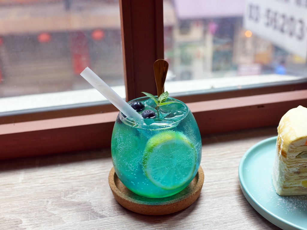 這杯是朋友點的,藍柑橘的顏色超藍(講什麼廢話?),顏色有嚇到我們,還以為是調酒咧,不過喝起來味道不錯,另外我點的是海鹽焦糖奶茶,因為拍起來跟喝起來都普普,我就不放照片了,下次會記得咖啡系列才是老闆專長!