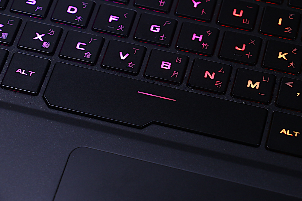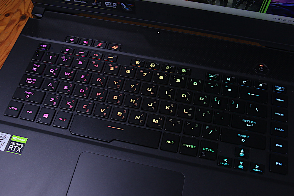 ROG Zephyrus S15 配備一組支援 RGB 燈光效果的 LED 彩色背光電競鍵盤,可透過  Aura Sync 來調整單一按鍵、整個鍵盤的燈光效果,提供恆亮、呼吸、閃爍、彩虹…等多種選擇,可視自己的喜好任意調整。另外,這組鍵盤還支援 N 鍵不衝突技術,即使在激烈操作的狀況下,也不怕指令互相衝突的狀況發生。