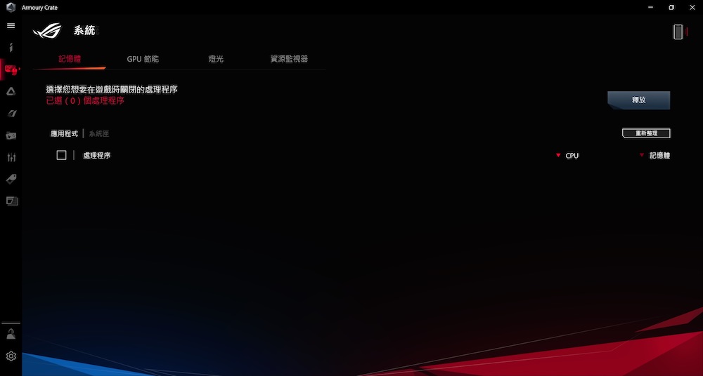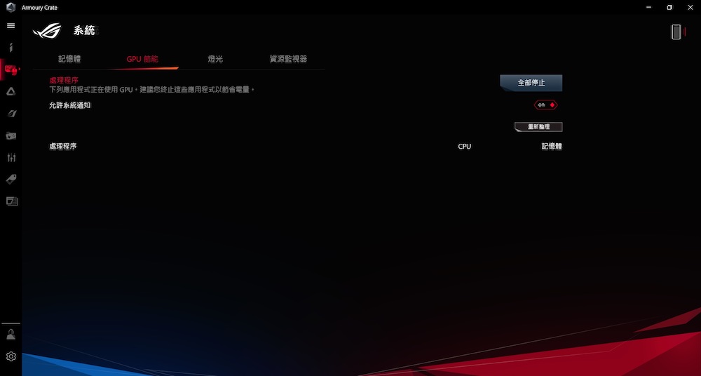 系統頁面中,玩家可自行釋放記憶體、關閉正在使用 GPU 的應用程式或是觀看資源監視器,輕鬆掌握筆電的運行狀況,並關閉正在耗電或影響效能的應用程式。