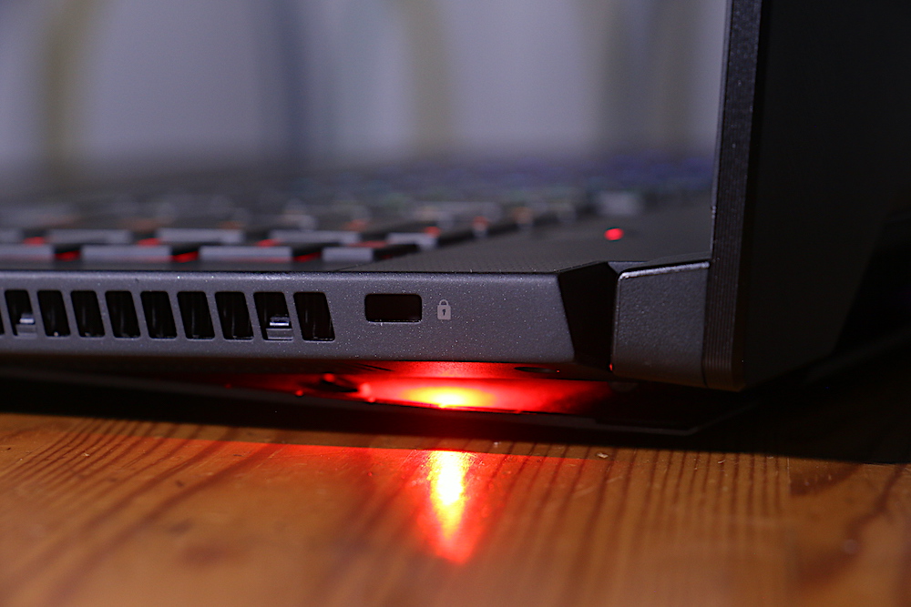 左側後端一樣配置一個可增加 22% 氣流的主動式空氣力學系統 (AAS),前端依序配置一個電源孔、一個 RJ45 LAN Port、一個 HDMI 2.0b、、一個 USB 3.2 Gen 2 Type-A、一個麥克風插孔與一個 3.5mm 耳機插孔。