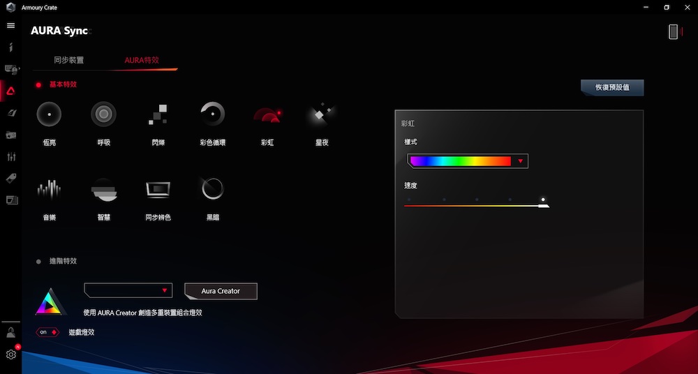 鍵盤、滑鼠的 RGB 燈光效果,統一由 Aura Sync 來做設定,除了基本的恆亮、呼吸及閃爍外,還另外提供彩色循環、彩虹、星夜、音樂、智慧…等模式,每個模式都能自行調整顏色以及顏色的變換速度,玩家可以任意搭配出屬於自己的風格。