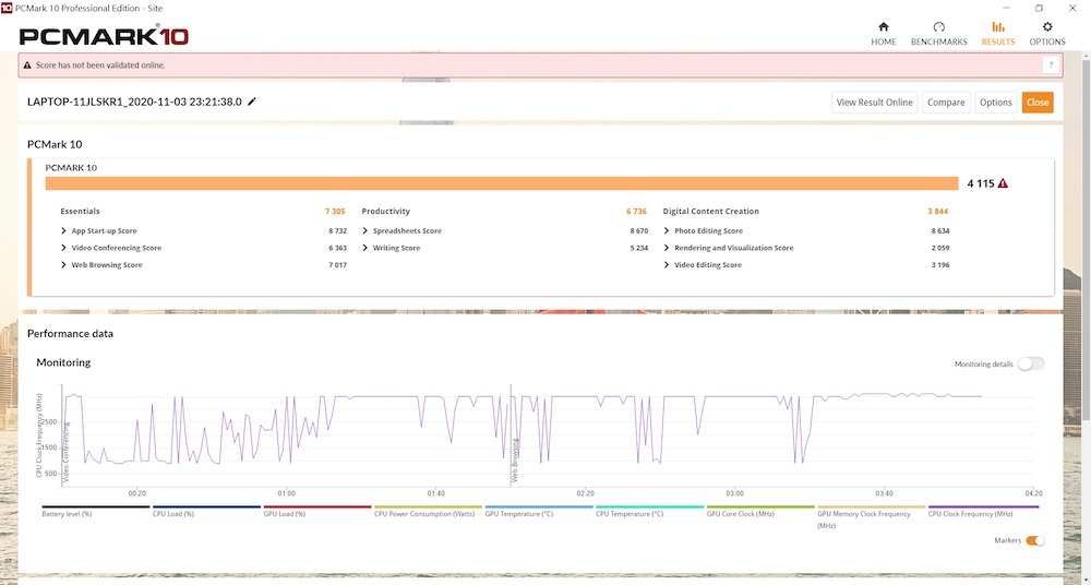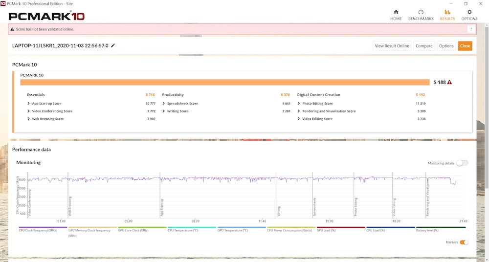 配備第 10 代 Intel Core i7-10875H 處理器、16GB DDR4-3200 RAM 的 ROG Zephyrus S15,運算效能非常優異。經 PCMARK 10 跑分軟體實測,在效能模式設為全開的狀態下測得 5,188 分,而當效能模式切換為靜音後也還有 4,115 分,不管是用全效能來玩遊戲或是用靜音模式來工作,都有非常強大的效能表現。