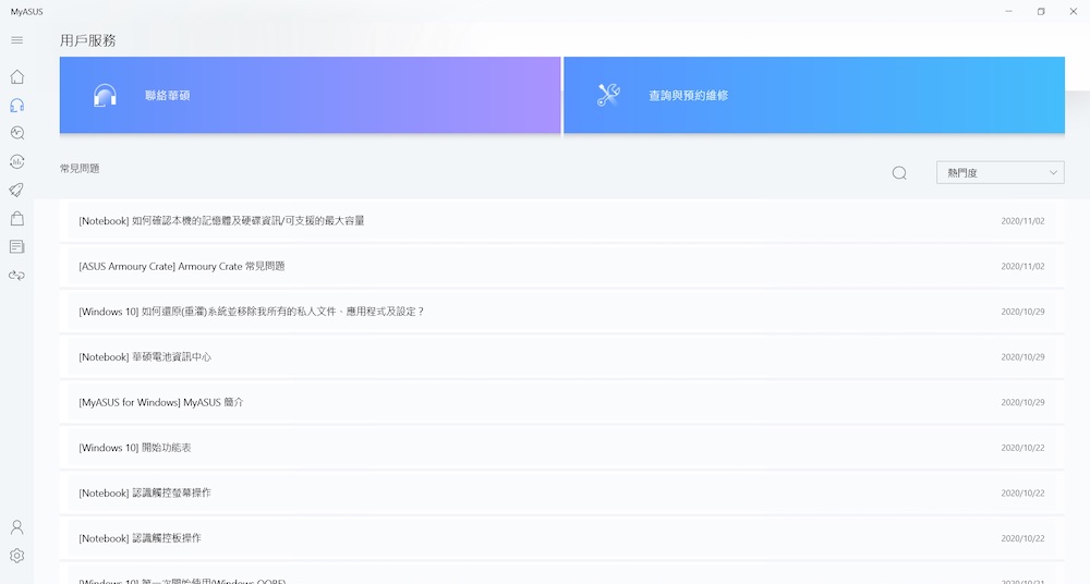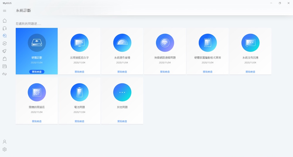 MyASUS 支援系統診斷功能,當遇到出現過藍底白字、系統運作緩慢、硬體裝置驅動程式異常…等問題時,可透過此功能先自我診斷,視診斷結果再決定是否要送修。若有需要送修,則可以透過用戶服務來聯絡華碩,或查詢維修據點並預約維修。