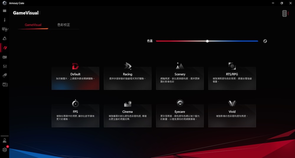 值得一提的是,此版本的 Armoury Crate 還支援 GameVisual 與色彩校正功能,前者提供多種螢幕模式,玩家可依照需求自行選用對應的模式,讓顯示效果更加出色;後者則是可以手動校正螢幕的色彩,讓每一個畫面的顏色都能準確的顯示,強化視覺體驗。