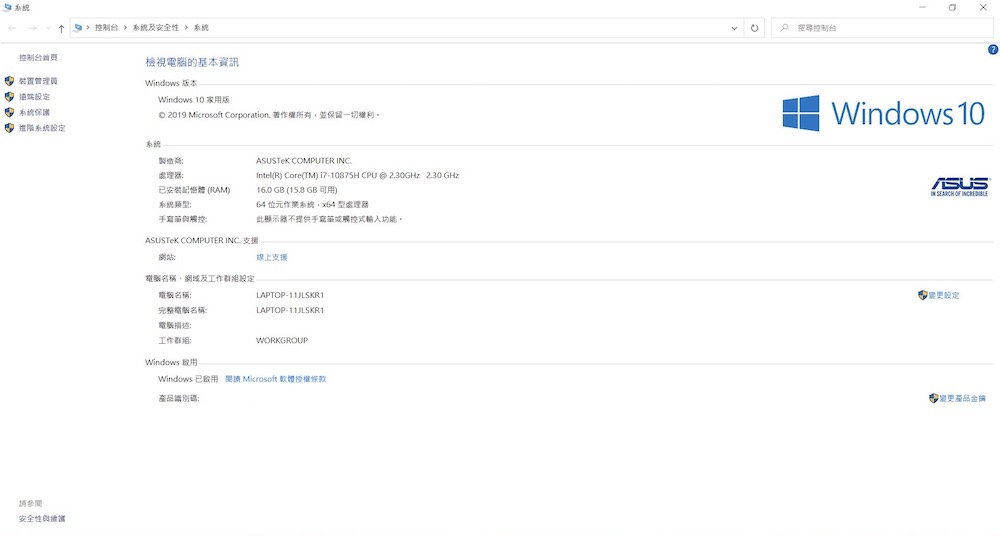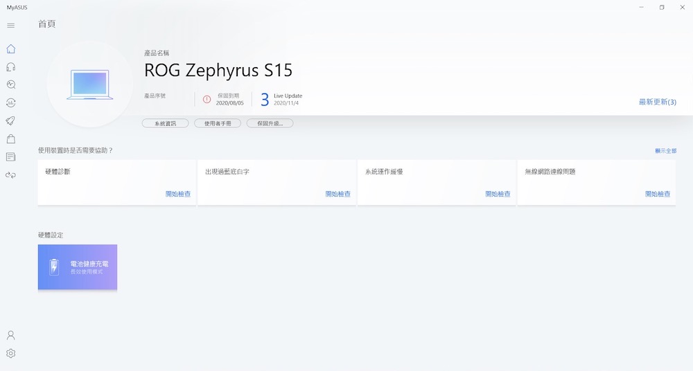 除了內建 Armoury Crate 外,ROG Zephyrus S15 還內建非常好用的 MyASUS 服務,這個服務與內建在 ASUS 商務筆電、桌電的相同,可以讓玩家自行檢視筆電的產品序號、保固期、軟體更新與系統資訊。