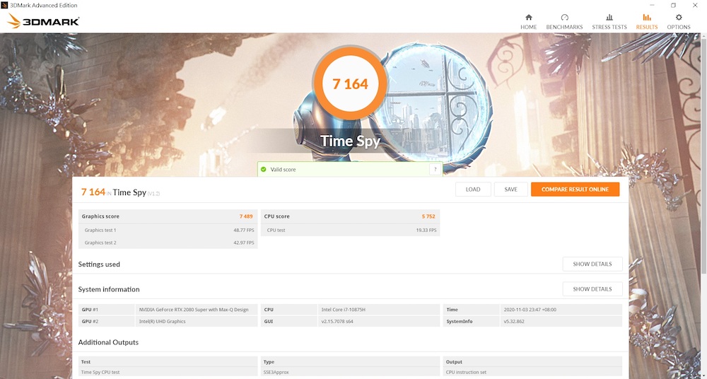 另外,我們也使用 3DMARK 11 來測試 NVIDIA GeForce RTX2080 Super 8GB GDDR6 VRAM 獨立顯示卡的運算能力。經實測,這張顯卡測得 7,164 分,運算效能同樣非常優異,除了可以輕鬆應付目前市面上所有遊戲外,就算要拿它來做專業影音後製、跑 3D 圖檔或設計圖…等,也絕對沒問題。
