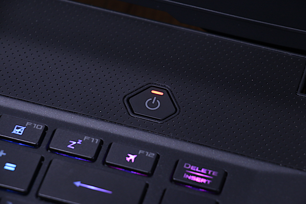 六邊形電源鍵設置在鍵盤右上角,開機後上方的紅色 LED 會恆亮,待機時則會閃爍。
