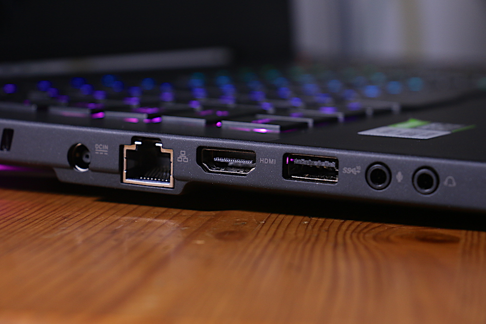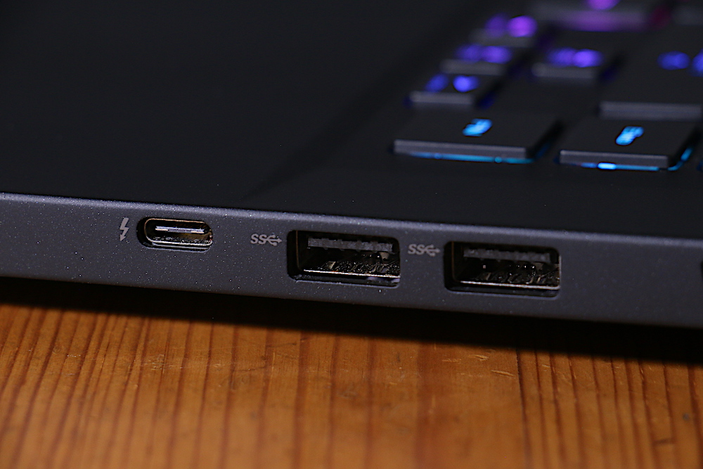 連接埠方面,ROG Zephyrus S15 右側配備一個 USB 3.2 Gen 2 Type C (支援 DisplayPort 1.4、Thunderbolt 3 及 Power Delivery 3.0)、兩個 USB 3.2 Gen 1 Type-A,後方則是一個防盜鎖以及可增加 22% 氣流的主動式空氣力學系統 (AAS)。