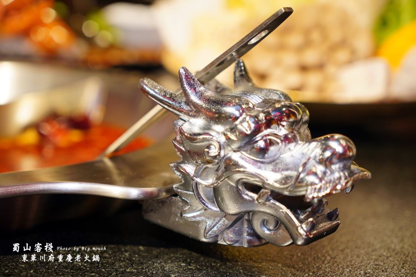 ▼沒多久火鍋上桌啦~~我們點的是蜀山鴛鴦老火鍋,這個特製鍋具一上桌就相當吸睛,兩邊各有一個龍頭,摸起來冰涼不燙手,既是擺飾也可以放置湯匙,整個相當有氣勢啊!