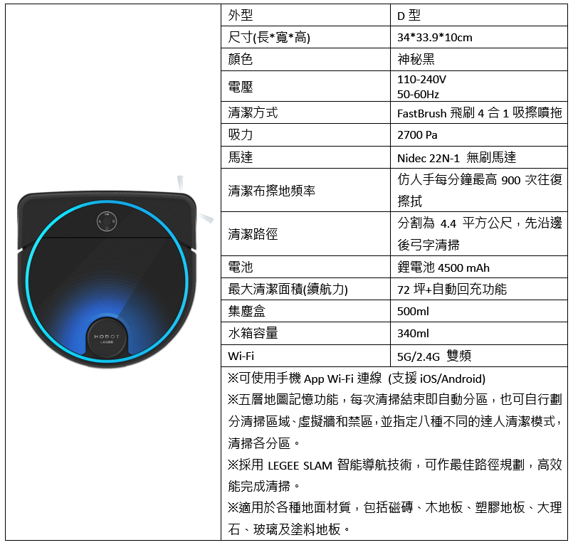 【HOBOT玻妞雷姬掃拖地機器人LEGEE 7產品規格表】