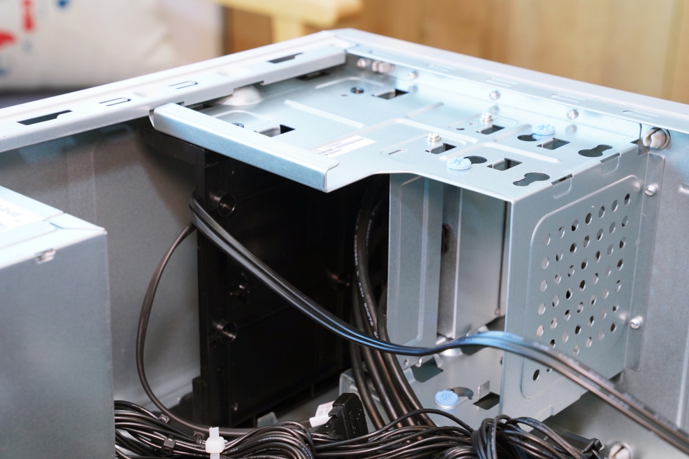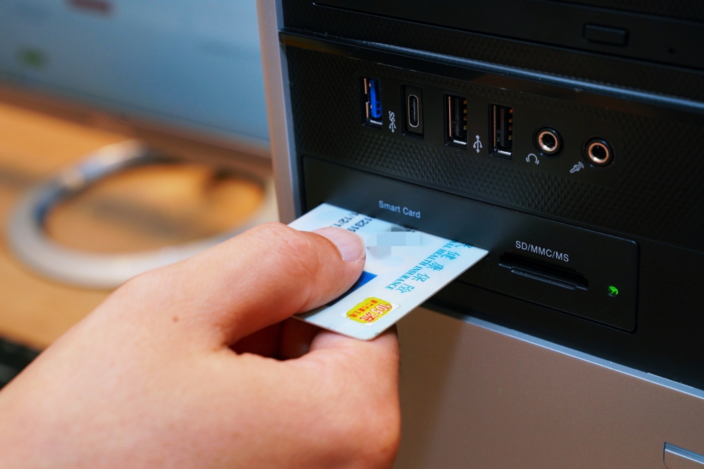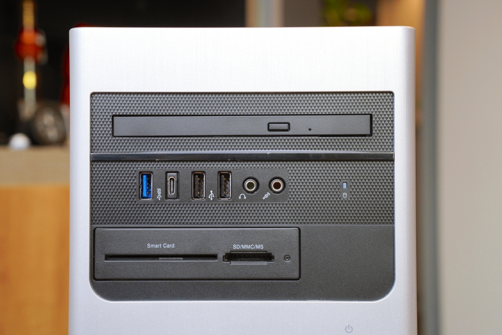 主機正面配置有:5.25 吋光碟機插槽、藍色的 USB 3.2 Gen 1 連接埠、Type-C 連接埠、兩個 USB 2.0 連接埠、麥克風與耳機連接埠。並且內建智慧卡讀卡機,支援自然人憑證與健保卡讀取,用來繳稅、訂購實名制口罩都很方便。以及 SD/MMC/MS/ 卡槽,方便讀寫記憶卡資料,不用再外接讀卡裝置。