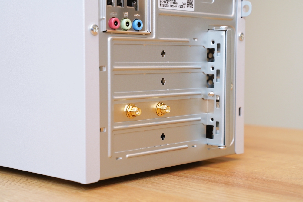 三個 Audio Jack(s) 下方提供 DVI、HDMI、DP,用於獨顯的輸出,與無線網卡的輸入連接埠,最下方有兩個擴充卡插槽擋板。推薦各位也可以另購華碩推出的無線網卡,插入即能快速連線。