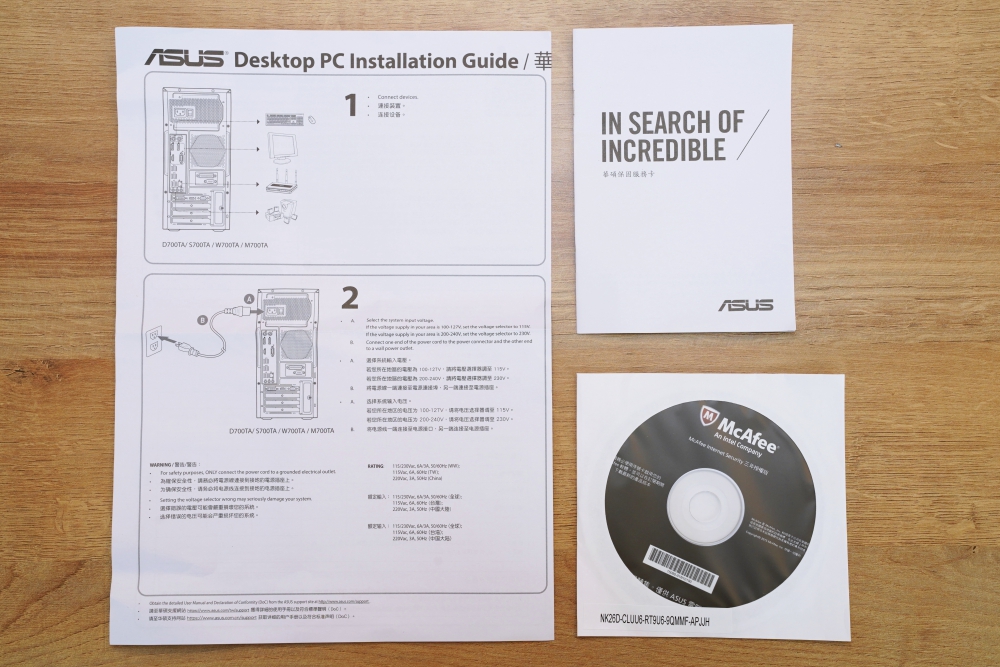 主機配備完整的配件:鍵盤、滑鼠、保固卡、電源線、個人電腦安裝指南、三年授權版防毒軟體 McAfee 邁克菲,整組一套附給你,不用為了省錢而購入雜牌滑鼠、鍵盤,整組一套使用起來就是有爽度。