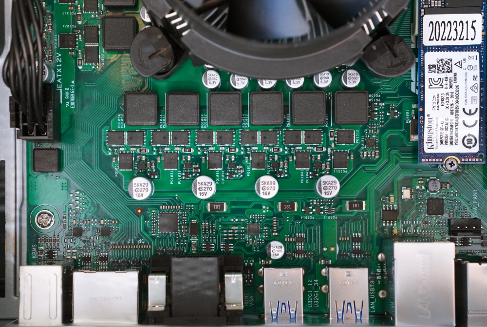風扇附近有固態電容器,採用 100% 台灣出廠企業級固態電容器,電容器可承受極端的溫度,提高系統穩定性與散熱能力,長時間使用之後,仍能維持流暢穩定的效能,讓 ASUS S700TA 桌上型電腦能夠達到長時間的穩定與耐用。