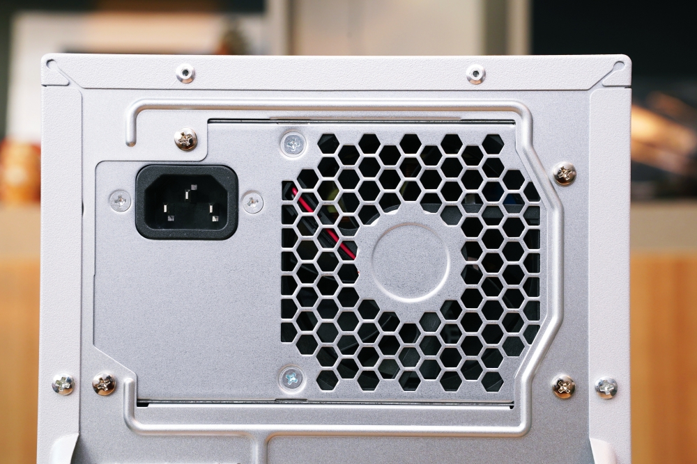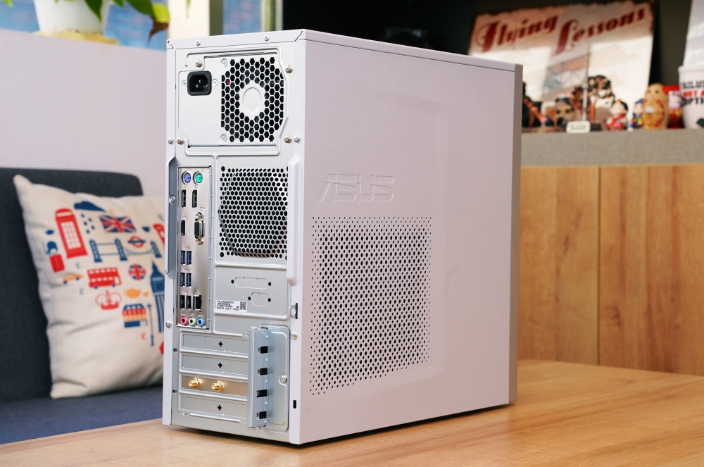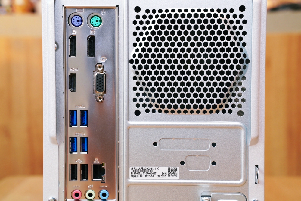 通風孔下方由上至下分別是一個 PS / 2 (鍵盤)、一個 PS / 2 (滑鼠)、兩個 DisplayPort 連接埠、配備 HDMI 輸出可連接外部顯示器,與一個 VGA (D-Sub) – Out、四個 USB 3.2 Gen 1 連接埠、兩個 USB 2.0、一個 RJ-45 網路連接埠,以及三個 Audio Jack(s) ,即是三色的麥克風連接孔、音效輸出孔與輸入孔、一個 COM Port (Serial Port)。算一算機身前後方多達 10 個 USB 連接埠。