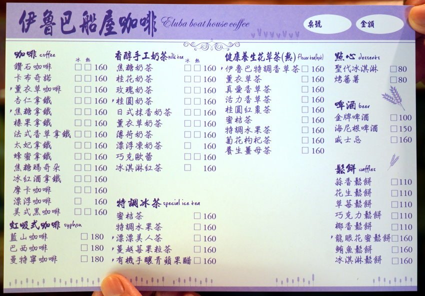 ▼伊魯巴船屋咖啡菜單,這裡有販售各種咖啡、奶茶、冰茶、養生花草茶、點心、啤酒、鬆餅等,不管是想要來杯飲品或是點心當作下午茶都很適合!(未滿十八歲請勿飲酒)