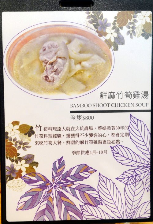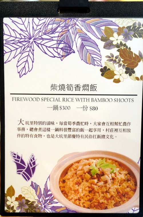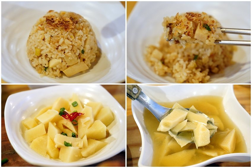 ▼柴燒筍香燜飯,這是大坑專屬的美味,每到筍季農忙時,大家就會互相幫忙採收,這時會煮一鍋豐富的竹筍飯一起享用,是大坑互相放伴的特有食物,也是大坑節慶特有民俗扛飯擔文化!採用自製的豬油、雞油下去拌炒,吃起來香氣十足又帶有筍香,搭配紅蔥頭提味更是香甜開胃~~蒜燒綠竹筍,帶有微蒜香的滋味,讓筍香鮮甜更是釋放得相當徹底,而且鮮嫩不乾柴,順口又好吃!鮮筍湯,帶有天然的鮮甜美味,甘甜順口又解膩,整個很可以啊!!