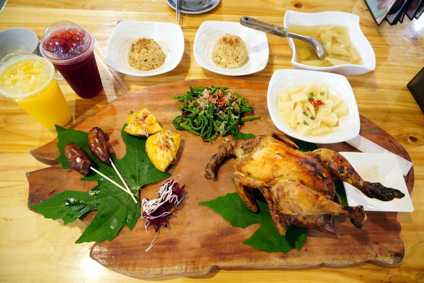 ▼木盤上頭有炭烤土雞、蒜燒綠竹筍、過貓、櫻花蝦焗烤地瓜、迷迭香香腸等餐點,再加上柴燒筍香燜飯、鮮筍湯及芒果汁、洛神花汁,吃起來豐盛又飽足!