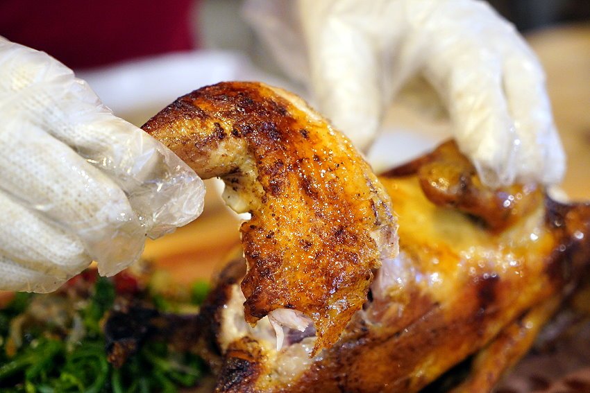 ▼一旁也附有手套讓大家更方便享用,先戴上工作手套再套上手扒雞手套也比較不這麼燙手!雞腿吃起來外皮香酥、肉質香Q多汁,還帶有淡淡的燻烤香氣,吃起來很是過癮!