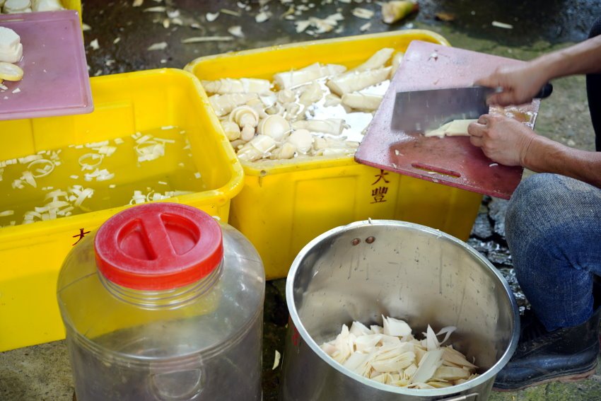 ▼只見工作人員一直忙著處理竹筍,要準備醃漬成一罐罐的筍醬!