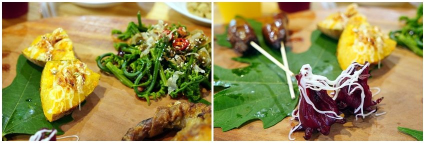▼櫻花蝦焗烤地瓜,採用台農57號地瓜加上起司、櫻花蝦下去焗烤,吃起來既有創意又香甜美味!過貓也是非常香嫩,簡單搭配醬料、柴魚片、辣椒絲提味,吃起來鮮嫩甜香又開胃~~整個很清爽啊!一旁還有洛神花本人,搭配沙拉吃起來酸香帶點微甜的味蕾頗為解膩!