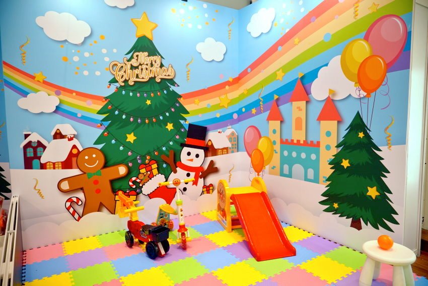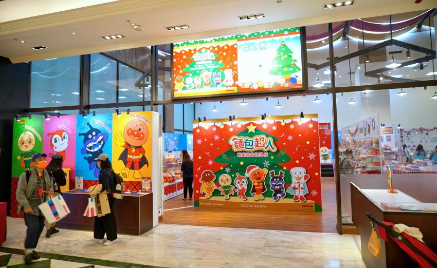 ▼門口的主題牆就是拍照打卡的重點之一啊~~~超可愛的麵包超人角色通通集合,搭配大紅背景及聖誕樹也很有耶誕節的FU啊!