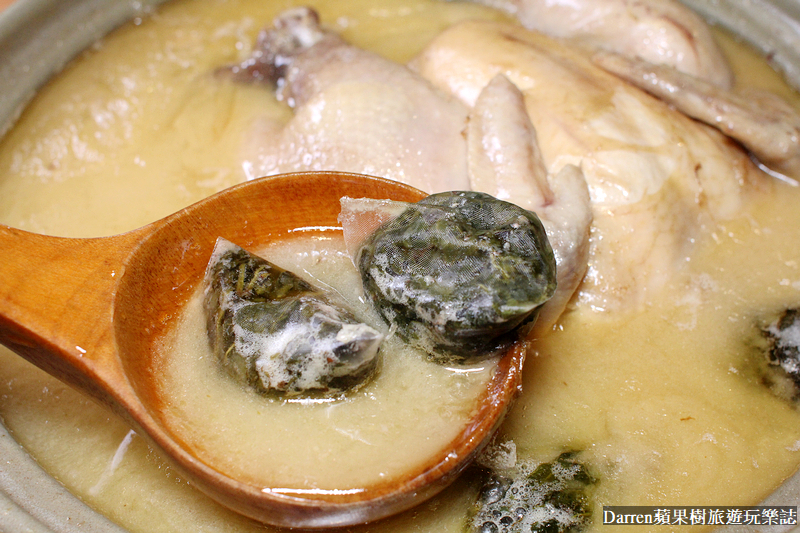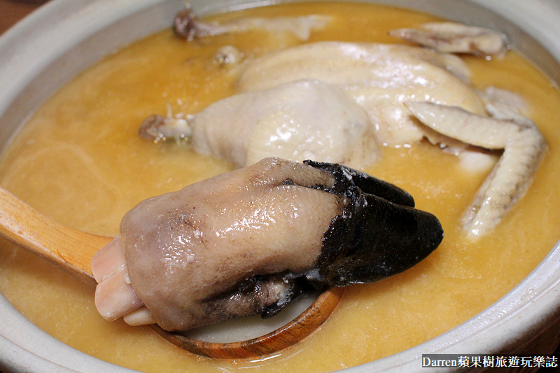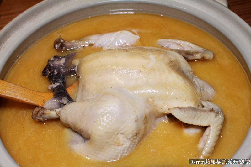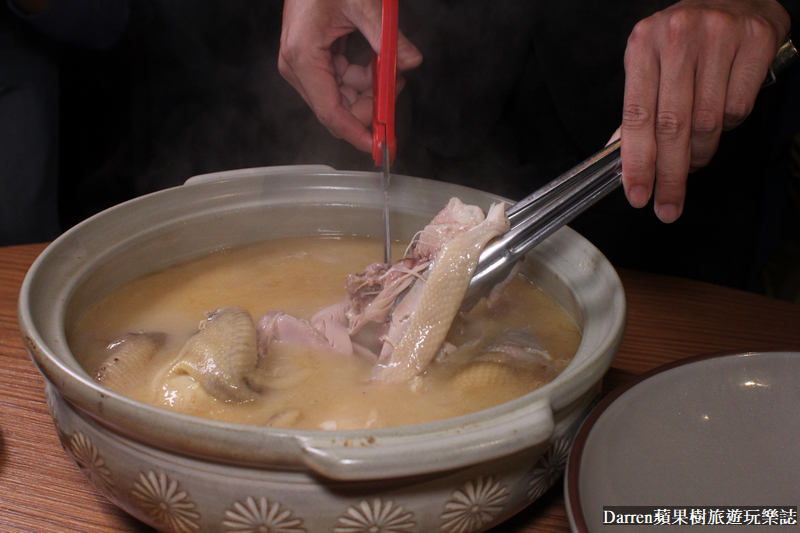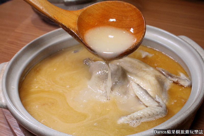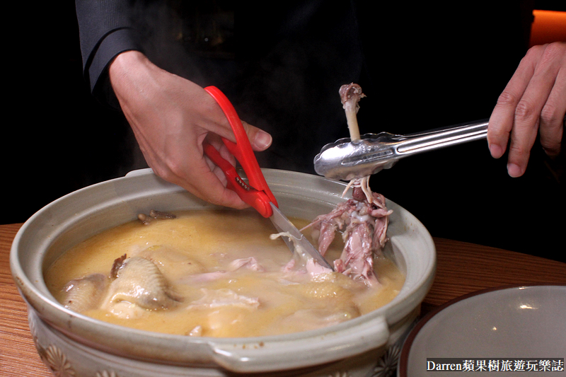 黃金雞湯燉煮夠久,服務生用剪刀輕鬆就能剪去掉雞骨,雞肉軟嫩不柴就連牙口不好的人都能輕鬆享用