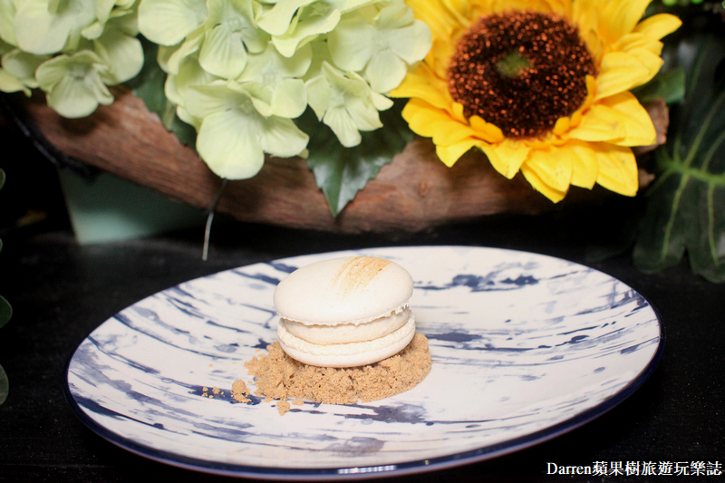 ▲百年麵茶馬卡龍,就連甜點也是主廚Adam親手做,使用台灣百年麵茶廠的麵茶粉,以及奶油乳酪、鮮奶油製成內餡,麵茶元素非常有趣,馬卡龍吃起來有著台味,親和力十足甜而不膩,身為甜點控的我很喜歡