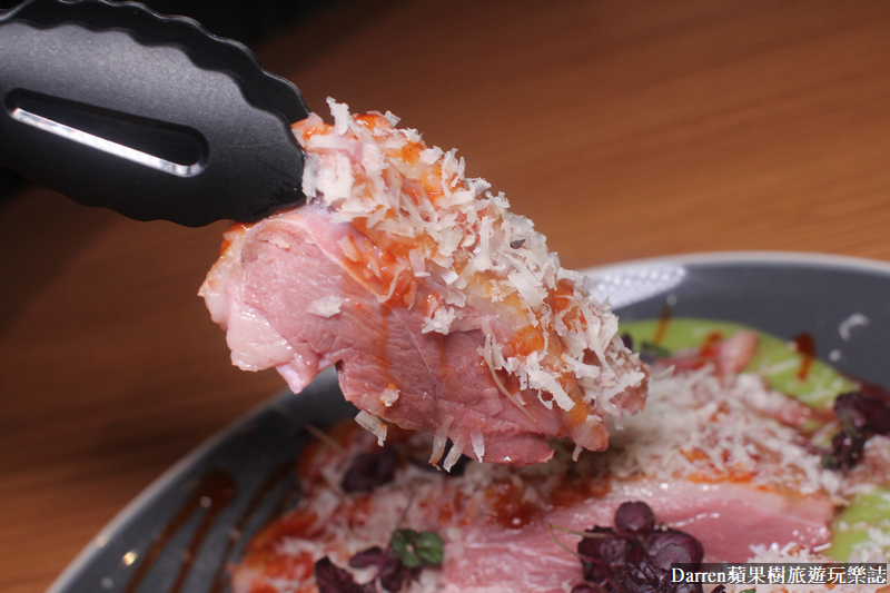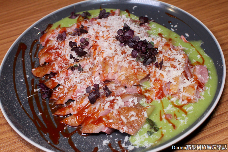 ▲▼片皮鵝肉這盤鵝胸的擺盤也很有學問,靈感發想自唐朝駱賓王詠鵝詩:鵝 鵝 鵝,曲項向天歌,白毛浮綠水,紅掌撥清波,表面撒上義大利陳年乾酪象徵鵝毛,紅色是味噌辣醬,綠色是有機水果黃瓜製成,熟成去骨片皮鵝肉,肉質鮮甜細嫩風味更加濃厚