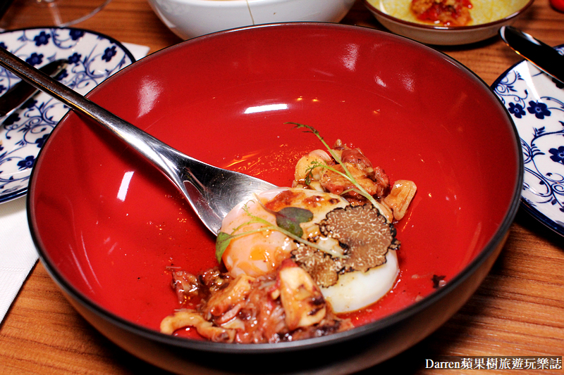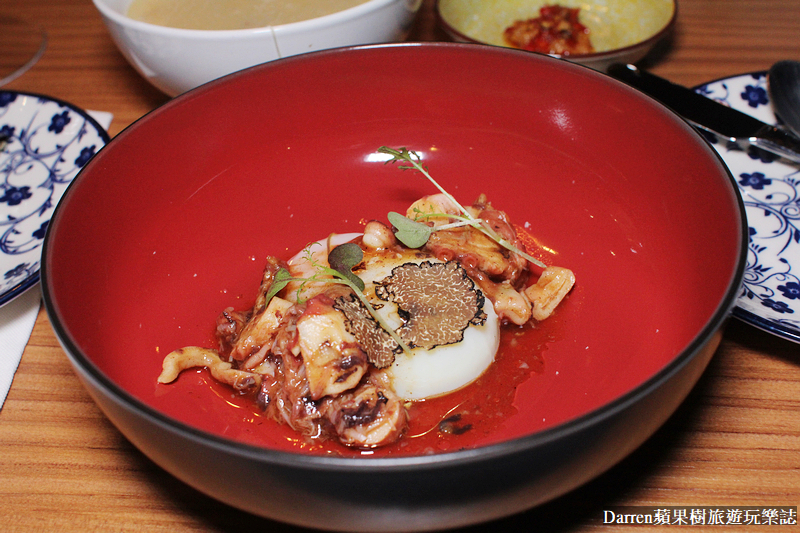 ▲▼澎湖章魚.五味醬.義大利黑松露,將澎湖章魚搭配五味醬,再刨上義大利黑松露,還有水波蛋是使用優質的金晶蛋,五味醬是亮點使用番茄、醬油、蒜泥、清醋、鹽等調製,蒜香以及微酸甜與章魚的組合鮮甜味美,還有加入松露油更香氣更上一層