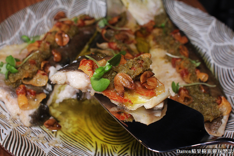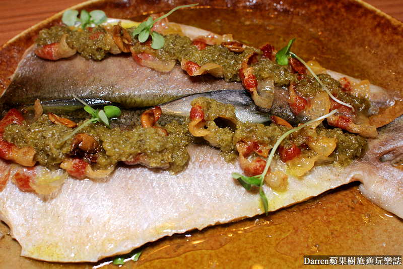 ▲▼現流海魚.萬丹剝皮辣椒.初榨橄欖油.破布子,俗語說一午二鮸三嘉鱲,這裡的午仔魚size很大,使用智利頂級初榨橄欖油搭配台灣破布子以及剝皮辣椒,一片片熟成臘肉是用台灣松阪豬做成,烤過後搭配午仔魚肉質軟嫰油脂豐富,鹹鮮提香滑口好吃,樹小編很愛這道料理
