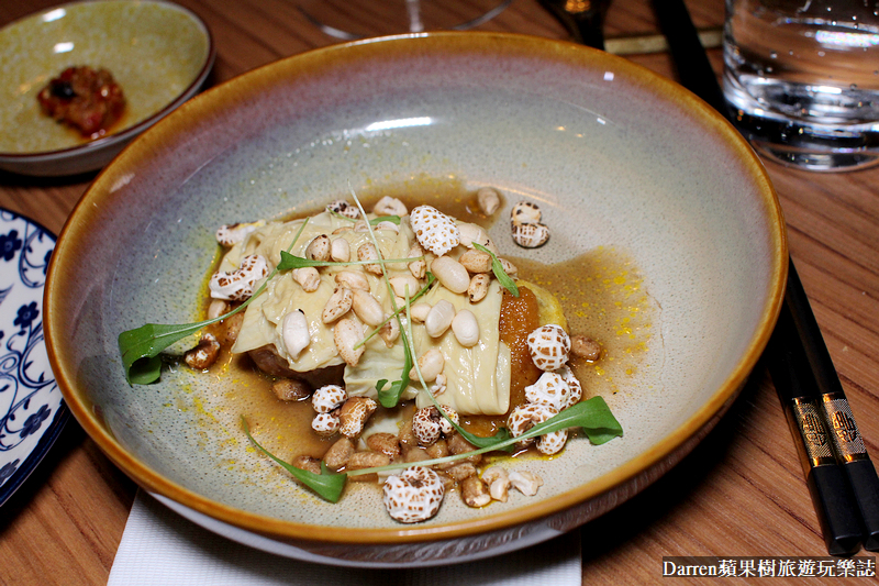 ▲▼屏東農產糯米粉.紅蔥蘿蔔醬.究好豬,來到法租界餐廳上菜後,如果不看菜單真得都超級難猜,好險主廚會說菜,猜不透也是來到法租界用餐樂趣之一,光是屏東農產水磨糯米粉以及究好豬,這兩種食材大家有興趣可以google一下,簡單來說都是萬中選一,只能說老闆很龜毛,挑食材跟挑老婆一樣,究好豬是台灣優質豬肉品牌,這道料理其中所使用的虎掌,不是老虎的手掌,而是每隻豬只有兩塊的豬膝韌帶,外觀是白色有如手掌般大塊狀物,還是從究好豬取來,虎掌有豐富膠質口感Q滑,加上有機薏仁爆米花,再使用鵝油以及紅蔥頭來提味,看似簡單料理層層剖析開來學問非常多