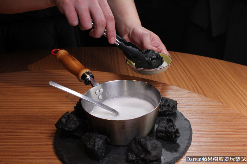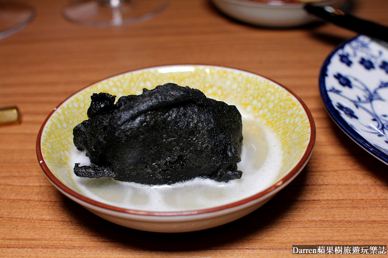 ▲▼台南黃金蜆.宜蘭有機絲瓜.霜鹽,又是一道讓人丈二金剛摸不著頭腦的料理,把這道料理放在IG上給大家猜是什麼,都沒有人可以猜到,看起來黑黑像木炭一樣的是竹炭絲瓜,這道料理也是法租界餐廳的招牌必點料理,宜蘭有機絲瓜外皮酥酥脆脆,裡頭仍保持細緻嫩口,吃法就是沾黃金蜆湯汁,增添鹹鮮滋味