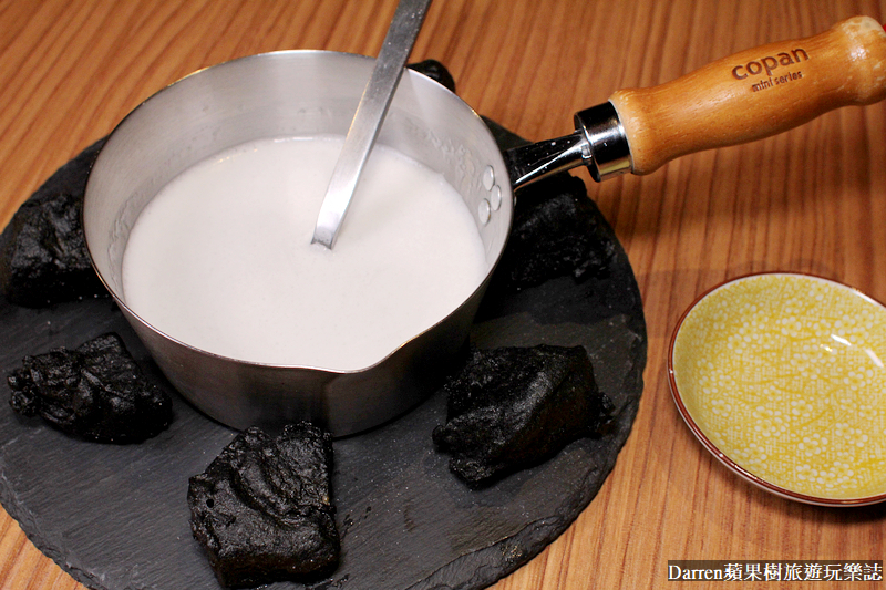 乳白色黃金蜆湯汁會先舀進小碟,再把竹炭絲瓜放下去沾一下,建議不要沾太久避免絲瓜外皮酥脆感不見