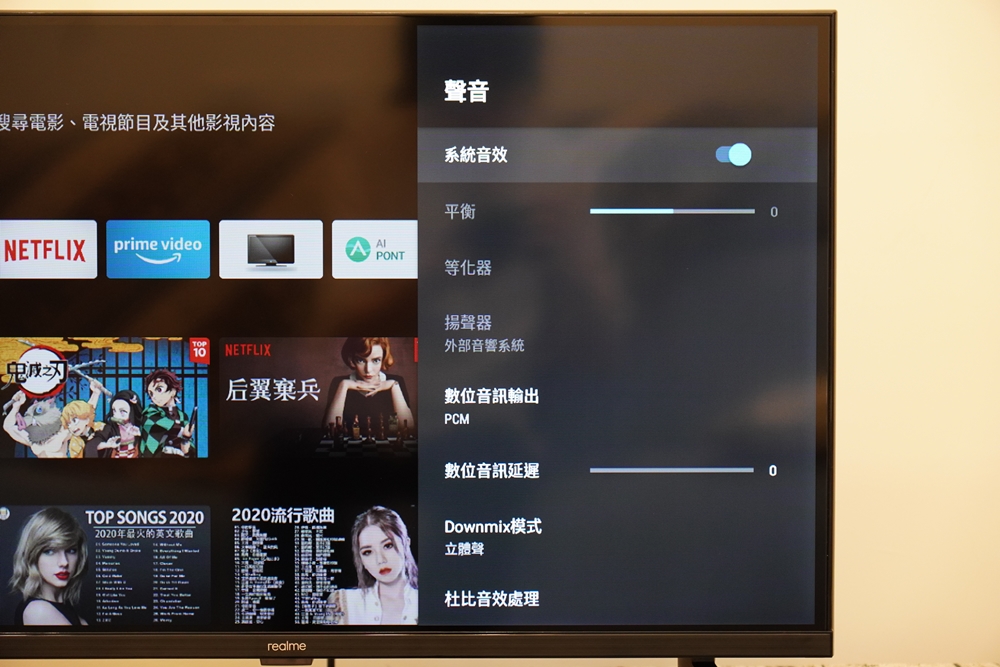 實際上播放最近很紅的鬼滅之刃主題曲來試聽,表現可以說是出乎意料之外的優異,一般 32 吋小電視內建的揚聲器聲音常常比較單薄或是聽起來比較扁,但 realme 智慧連網顯示器的揚聲器效果有做到渾厚、渾圓的效果,音量也夠大,如果想要緊閉門窗大聲一點聽音樂的話也可以打造出很不錯的收聽效果。