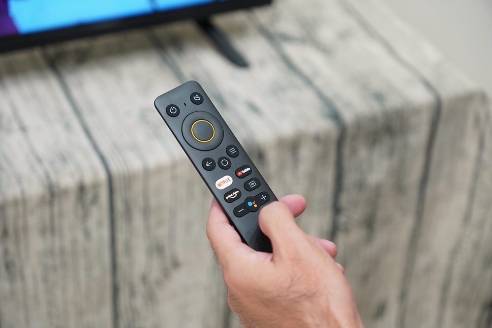 realme 智慧連網顯示器的遙控器設計的簡單易操作,可以直覺的開關機、選取不同 app、快速開啟 Netflix、YouTube、Prime Video 或使用 Google 語音助理。