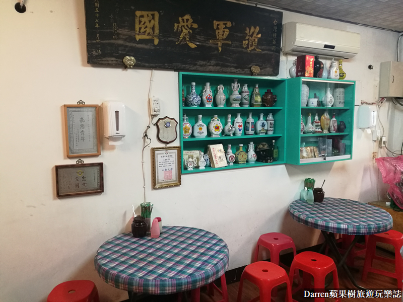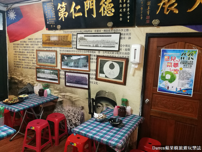 店內的裝潢是復古眷村風格,門口也有滷味攤位擺在外面提供外帶,走進裡頭有內用座位,用餐空間牆面裝飾都是懷舊海報、照片、軍用物品等等