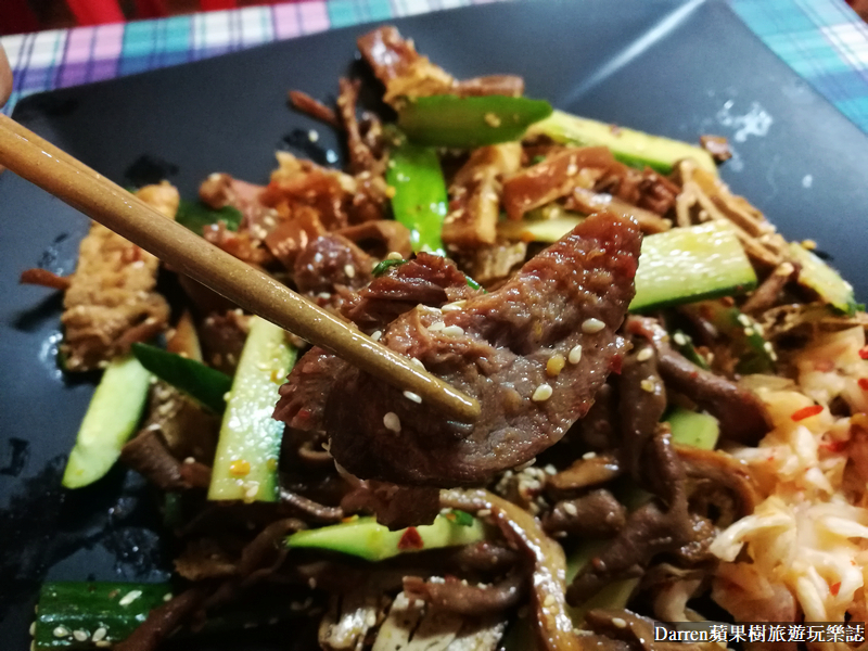 滷味櫃內有滿滿的滷味,一開始看到這麼多滷味一定會有選擇障礙,有鴨頭、鴨皮、鴨翅、鴨脖、鴨脆腸、牛肚、牛腱、素雞、甜不辣、黃瓜、豆干、海帶等,反正就是選自己喜歡吃的XD,選擇夾取好再給店家,會分切後灑上芝麻、蔥花、泡菜等等