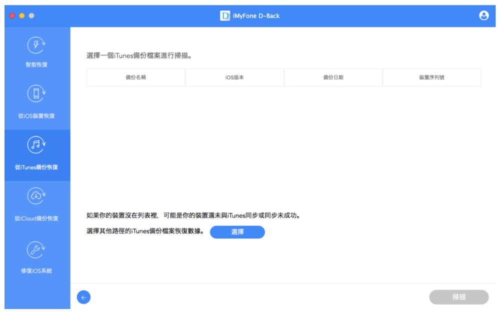 如果你有備份的習慣,就可以直接使用「 iTunes 或 iCloud 備份回復數據」,一樣是下載並安裝 iMyFone D-Back,打開軟體後選擇「從iTunes備份恢復」,就會看到以下介面。