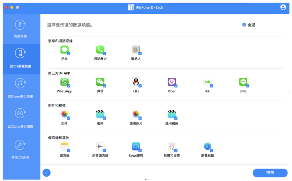 步驟3:在「從 iOS 裝置恢復」的介面點擊後,它會讓你選擇想要掃描的範圍。如果你已經有明確想要救援的部分,就可以直接勾選特定資料,而無需花時間掃描全部資料了。比如是要救回 iPhone 裡的照片,那就只勾選「照片」即可。