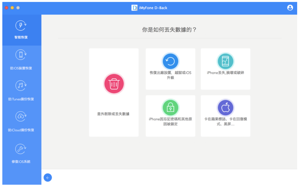 步驟2:選擇遺失檔案的情形,進入繼續掃描和恢復。如果是意外刪除就可以點選最左邊的選項,而它也會它直接導到「從 iOS 裝置恢復」的介面。