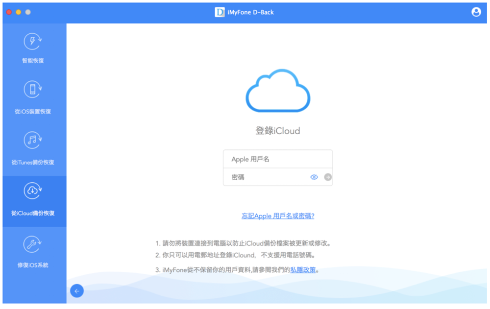 又或是可以點選「從 iCloud 備份恢復」,但需要額外填寫 Apple 帳號以及密碼,以進行修復動作。